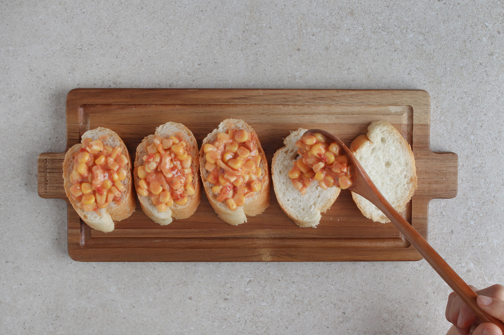 바게트 위에 매콤 콘치즈를