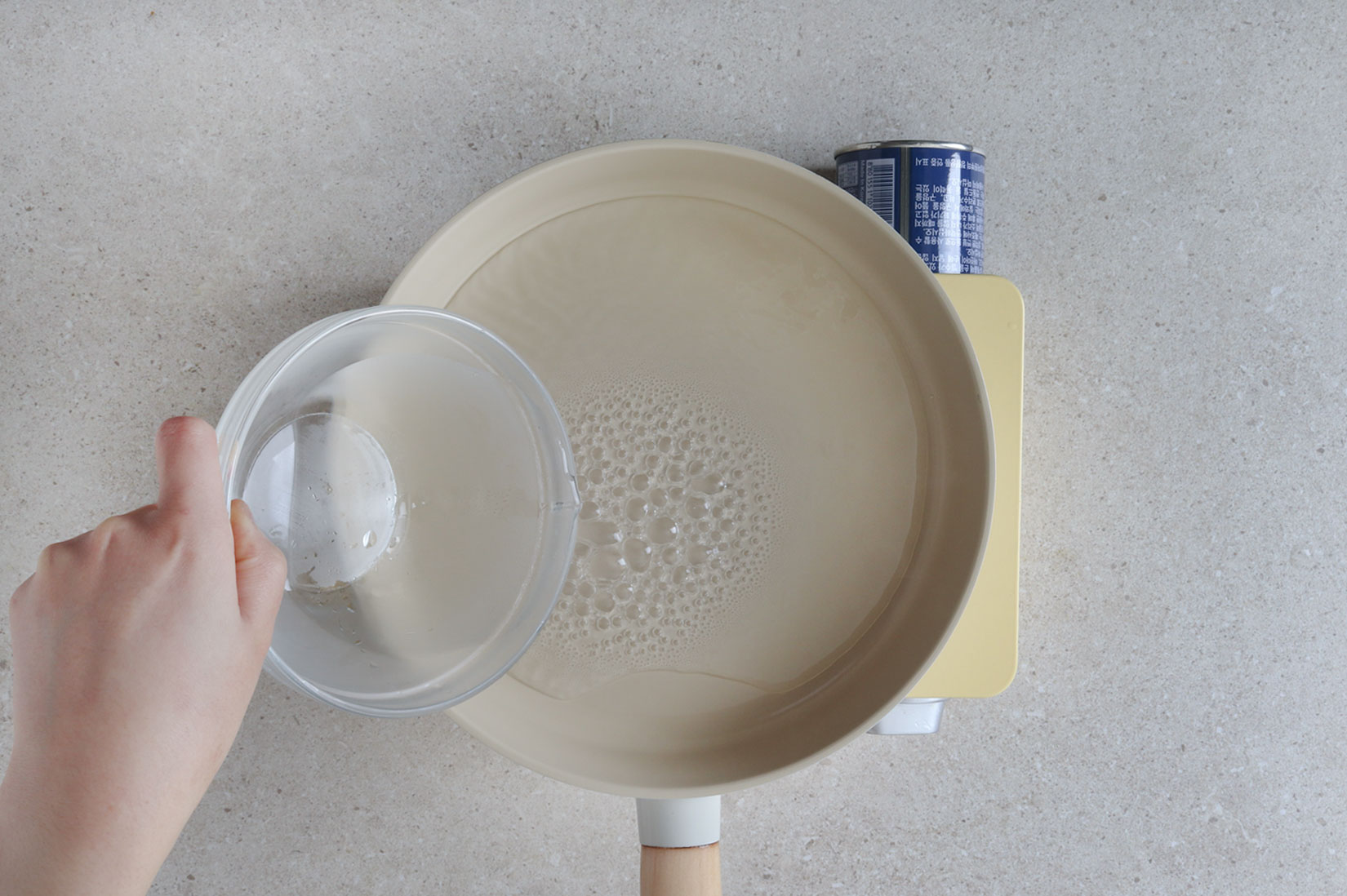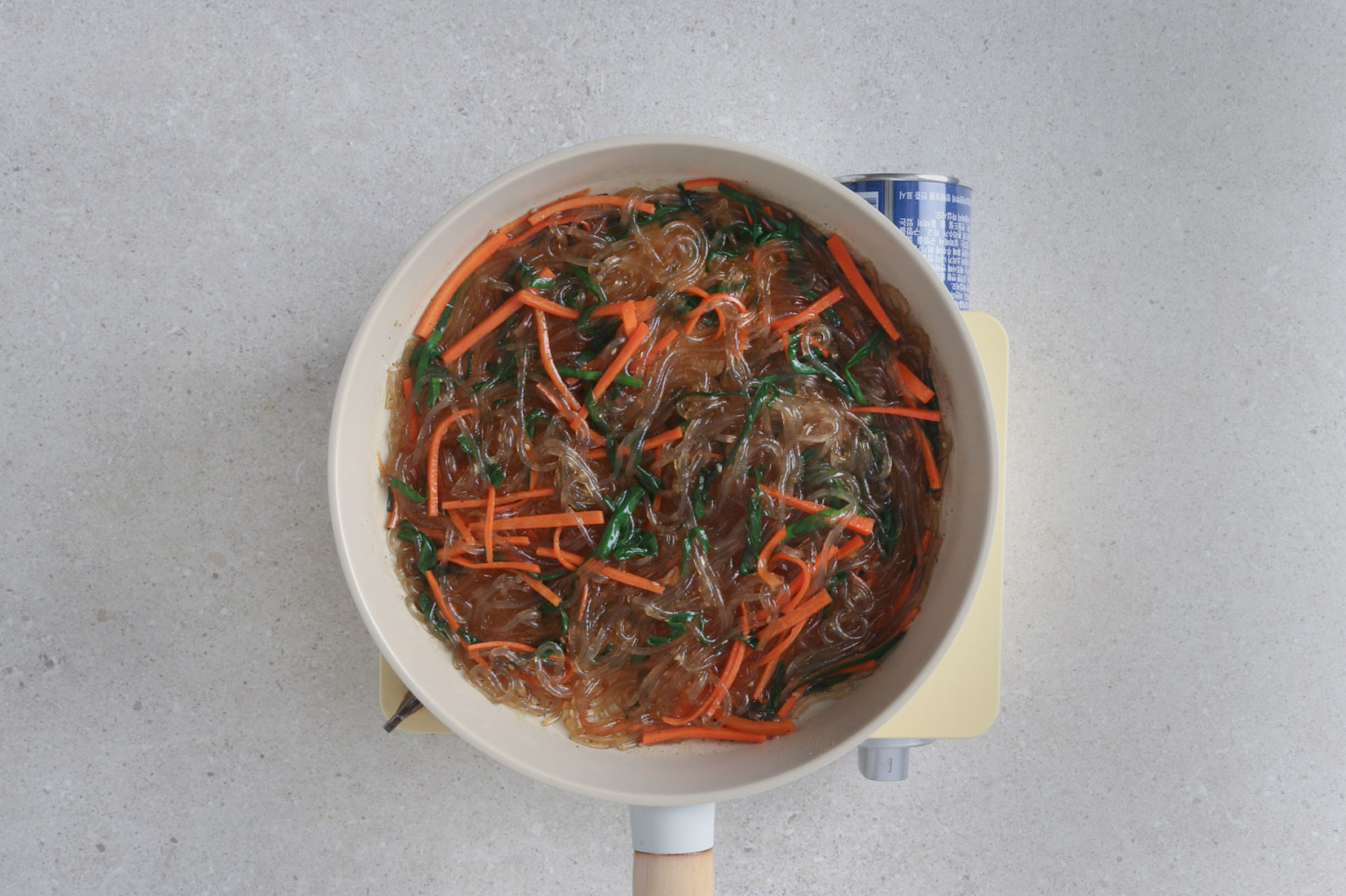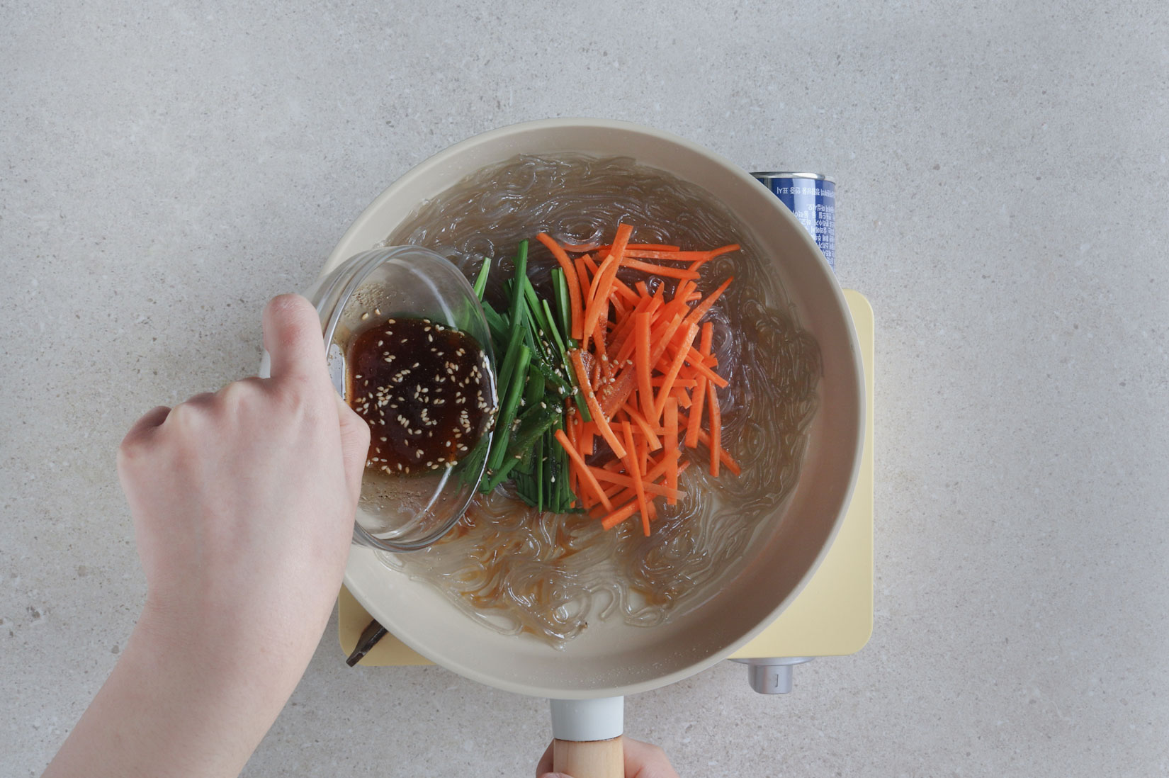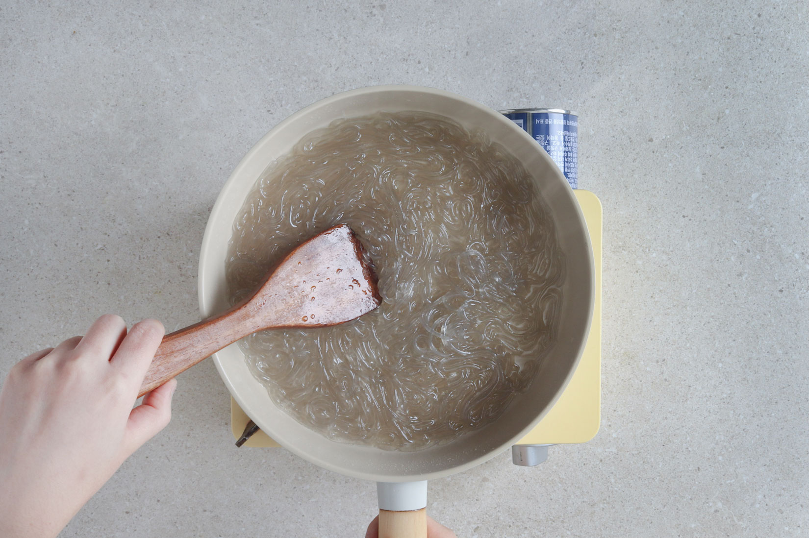 달군 팬에 물, 불린 당면,