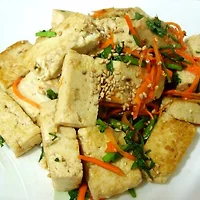 겉은 바삭하게, 속은 부드럽게 아주 잘~ 익은 두부스테이크 위에서 춤사위를 보여주는 가다랑어포~