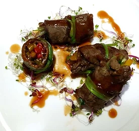 2014년 이금기 요리대회 예선전, 우송대학교 출품작 강윤기 - 바비큐소스를 발라구운 한방떡갈비 소고기 부위중 가장 부드럽고 맛있다고 할 수 있는 갈비살을 이용하여, 달달한맛을 더해줄수있는 바비큐소를 이용하여 발라구워주고 인삼을 더한 한방 떡갈비. 단호박과 밤을 이용한 퓨레를 곁들여 달콤함을 더해주고 떡갈비위에 크러스트를 올려 바삭함과 부드러움을 동시에 느낄수 있습니다. 또한 대전지방의 지역품인 부추와 표고, 배를 이용한 사이드 메뉴를 간장 마늘 중화매실소스를 이용해만든 드레싱에 버무려 새콤달콤한 맛을 주었습니다. 재료 : 갈비살 130 g , 표고버섯 2 ea , 생크림 50ml, 단호박 1/4 ea, 찹쌀가루 10g, 밤 2 ea, 매실소스 1 Ts, 부추 30g, 치킨파우더 3 Ts, 인삼 1뿌리,..