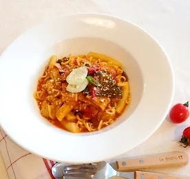 두반장 통볶이 레시피 얼마 전 1박 2일에서 배우 최강희씨가 만든 너볶이가 화재가 되었죠? 저도 놓칠새라 새롭게 너볶이를 준비해보았어요. 이금기 두반장 소스로 새롭게 태어난 통볶이 소개합니다!!! 주의! 너무 맛있어서 계속 먹다보면 속쓰려요~ 살도 쪄요~ ㅠ.ㅠ + 통볶이 재료 + 재료: 오뚜기 오동통면, 떡볶이떡, 토마토소스, 고춧가루, 양파, 고추 라면 1인분 끓이는 양의 물에 토마토 소스 2큰술, 라면스프 1/3 을 넣어주세요. 양념 넣은 물이 바글바글 끓어올르기 시작하면 떡볶이떡, 오동통 면, 오뎅,양파를 투하! 모든 재료들이 바글바글 끓기 시작할 때 마지막으로 굴소스 1/2큰술을 넣어주고 약한 불에 살짝 졸여주세요! 접시에 담아 홍고추, 청고추를 송송 썰어서 얹어주면 끝! 완성된 통볶이~!!!!..