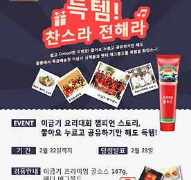 이금기 신제품 썸네일형 리스트형 [당첨자발표] 득템 찬스라 전해라~! 좋아요 누르고 공유하기만 해도 득템 찬스! 안녕하세요! 소스킹이에요~ 홍콩에서 특급배송된 이금기 레어템과 따끈따끈한 이금기 신제품을 받을 수 있는 이벤트! 많은 분들이 참여해 주셨는데요. 기다리셨을 당첨자 발표 바로 하겠습니다. 짝짝짝~~ 모두 축하드립니다! 당첨되신 분들은 남겨주신 주소로 아래 두가지 경품을 모두 보내드립니다! 경품 따끈따끈 신제품~* 이금기 프리미엄 굴소스 167g 어디에서도 구할 수 없는 레어템! 이금기 팬더 에그몰드 소스킹은 맛있는 이벤트로 다시 또 찾아뵐게요~!! 2016/02/21 - [요리열전/이금기 레시피 뱅크] - 보양식으로 손색없는 한그릇 요리~ 굴소스 해물 누룽지탕 더보기 득템 찬스라 전해라~! 좋아요 누르고 공유하기만 해도 득템 찬스! 득템 찬스라 전해라~♬ 쉽고 Cooool한 이벤트! 좋아요 누르고 공유하기만 해도 홍콩에서 특급배송된 이금기 레어템을 득템할 촤안스~! 기간 2016년 2월 22일까지 당첨발표 2016년 2월 23일 참여방법 페이스북에서 참여하기 아래 URL의 게시물을 좋아요+공유하기 해주세요 http://www.facebook.com/korea.lkk/posts/541474766019433 http://www.facebook.com/korea.lkk/posts/541192212714355 http://www.facebook.com/korea.lkk/posts/541191382714438 트위터에서 참여하기 아래 URL의 게시물을 리트윗+트위터 팔로잉 해주세요 http://t.co/4C4Zqo3ugL http://t.c.. 더보기 [당첨자발표]짜서 쓰는 튜브 굴소스! 이금기 프리미엄 굴소스 327g 구입하고 홍콩 가자! [당첨자발표] 짜서 쓰는 튜브 굴소스! 이금기 프리미엄 굴소스 327g 구입하고 홍콩 가자! 안녕하세요~ 지난 2015년 11월 15일~ 2016년 1월 15일까지 온오프라인에서 동시에 진행되었던 이금기의 신제품 짜서 쓰는 튜브 굴소스! 이금기 프리미엄 굴소스 327g 구입하고 홍콩가자! 많은 분들이 참여해 주셨던 이벤트의 당첨자를 발표하겠습니다!! 두두두두~~~ 160만원 상당의 홍콩여행권에 당첨되신 다섯분은?!! 짝짝짝~~ 축하드려요! 당첨되신 분들께는 담당자가 직접 개별연락을 드립니다. 다시한번 참여해 주신 모든 분들과 이금기 소스를 애용해 주시는 분들께 감사드립니다. 소스킹은 더 맛있고 즐거운 이벤트로 다시 돌아올게요! 2016/01/22 - [이금기 이야기/이금기 이야기] - 이금기에서 판매되고.. 더보기 이금기에서 판매되고 있는 업소용 대용량 완소♡ 소스들을 소개합니다! 이금기에서 판매되고 있는 업소용 대용량 완소♡ 소스들을 소개합니다! 안녕하세요~ 소스킹이에요! 오늘은 이금기에서 판매되고 있는 다양한 소스들 중 업소에서도 사용할 수 있는 대용량 소스들을 소개해 드릴게요. 얼마 전에 종영했던 강호대결 중화대반점에도 대용량의 이금기 소스들이 화면에 잡혔었는데요. 시식단을 위한 요리를 할 때 사부님들과 수제자분들께서 유용하게 사용하셨어요. 많은 양의 음식을 준비해야 하는 경우엔 요렇게 대용량 소스를 사용하시면 정말 편리하답니다. 업소용 대용량 제품 구매 문의는 080-024-2311 이금기 프리미엄 굴소스 굴의 강한 감칠맛이 살아있는 이금기 프리미엄 굴소스~ 128년 역사의 원조 굴소스로 한국 중식 셰프의 92%가 사용하시는 굴소스랍니다. 이금기 팬더 굴소스 농후한 색상과 .. 더보기 닭개장 맛있게 끓이는 법! 두반장을 꼭 넣으라고 전해라~ 건더기 푸짐하게 넣고얼큰한 국물맛이 일품인 닭개장~ 여름에도 많이 먹지만추운 겨울날에도 보양식으로 참 좋아요. 맛있는 닭개장을 끓이는 방법!집에서 어렵지 않게 만들 수 있는 레시피 알려드릴게요. 닭개장 맛있게 끓이는 법!두반장을 꼭 넣으라고 전해라~ :: 재료 :: 닭반마리통후추통마늘대파버섯숙주나물고사리홍고추 양념장다진마늘 1큰술고추가루 2큰술이금기 고소하고 부드러운 두반장 1큰술국간장 1큰술 육개장에 들어갈 닭이에요.반마리를 준비했습니다. 먼저 닭을 삶아주세요.대파, 통후추, 통마늘을 넣고 잘 익혀주세요.닭을 삼고 난 후 육수는 체반에 걸러 주세요. 삶은 닭고기는 손으로 잘게 찢어서 준비해 주세요. 대파와 홍고추를 어슷 썰어주 준비해 주세요. 고사리는 끓는.. 더보기 이금기 코스트코 온라인몰 오픈! 이금기 중화소스 4종세트를 만나보세요. 이금기 코스트코 온라인몰 오픈 이금기 중화소스 4종세트를 만나보세요! 안녕하세요~ 소스킹이에요! 주말 잘 보내고 계신가요? 오늘은 반가운 소식을 가져왔어요. 이금기 중화소스 4종세트를 이제 코스트코 온라인몰에서도 만날 수 있게 되었습니다! ☞이금기 코스트코 온라인몰 바로가기☜ 4종세트의 첫번째는 이금기 프리미엄 굴소스 510g! 1888년 탄생한 원조 굴소스로 강한 감칠맛이 살아있어요. 최고 품질의 생굴로만 만든 대표 굴소스랍니다.^^ 두번째는 그린팬더 굴소스 510g 기존 굴소스보다 순하고 담백한 맛의 굴소스로 MSG가 첨가되지 않은 웰빙제품이에요. 간장이 들어가는 요리에 간장 대용으로 쓸 수 있구요. 다른 소스랑 섞어서 요리해도 좋답니다. 세번째는 고소하고 부드러운 두반장 385g 매운맛, 구수한 맛.. 더보기 [셰프의 레시피] 호텔 리츠칼튼 서울 취홍 왕병호 셰프님의 짬뽕라면 강호대결 중화대반점에서 부드러운 카리스마로 하얀 화선지