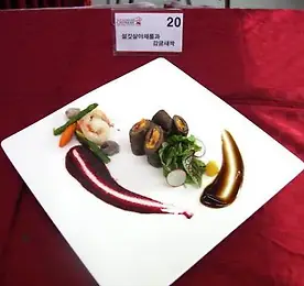 2014년 이금기 요리대회 예선전, 한국호텔관광전문학교 수상작 김희동 - 견과류 크러스트와 중화바베큐소스를 곁들인 아스파라거스 약선 소고기롤 많이 질기다고알려져있는 척아이롤을 약재를 우려낸물에 오랜시간 삶아 부드럽게 만들었습니다. 중화소스와 한약재가 조화롭게 어우러진 요리입니다. 재료 : 월계수, 새송이, 바비큐소스, 정향, 호두, 해선장, 통후추, 전분, 굴소스, 계피, 파, 물, 진피, 아몬드, 감초, 다시마, 콩가루, 대두유, 아스파라거스 양파 사용한 이금기 소스 : 해선장, 굴소스, 바비큐 소스 요리 방법 소요시간 : 90분 1.다시마와 월계수, 정향, 진피, 계피, 감초, 바비큐 10ml, 해선장5ml, 굴소스5ml 를 넣고 충분히 끓여준다. 2.밑간을 한 고기에 아스파라거스를 넣고 말아준다. ..
