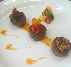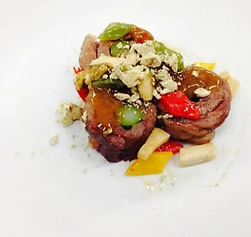 2014년 이금기 요리대회 예선전, 한국호텔관광전문학교 출품작 강영조 - 달콤한 소스와 마라소스를 곁들인 설깃요리 모양이 같은 세 가지 설깃살 요리가 서로 다른 단맛을 냅니다. 거기에 메인 소스는 약간 짭쪼름 하면서도 매콤한 맛을 냅니다. 설깃살이 질긴 부위이지만 위 조릿법을 이용하여 적절한 식감을 내어 맛을 높이려고 하였습니다. 재료 : 다짐육 130g, 생크림 1T, 태국건고추 8개, 돼지목살 40g, 표고버섯 1개, 마늘 50g, 비계 10g, 애호박 1/4개, 소금 5g, 청피망 1/4개, 방울토마토 2개, 후추 5g, 홍피망 1/4개, 감자 1/2개, 설탕 20g, 노란 파프리카 1/4개, 양송이 1/2개, 청주 40g, 양파 1/6개, 청양고추 1개, 고추기름 30ml, 노추 1/2T, 굴소스..
