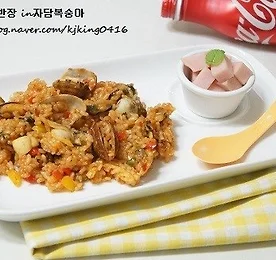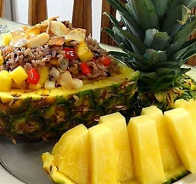 돌아온 파인애플 볶음밥~ 하와이안토속음식인 파인애플 볶음밥을 만들어봤어요. 옛날에 하와이안 레스토랑 가서 맛나게 먹었던 기억이 나서~ 바베큐소스와 굴소스로 쉽게 완벽재현했죠~ 상큼함과 풍부함이 공존하는 맛~ 한번 만들어볼까요? + 파인애플 볶음밥 재료 + (4인분 기준) 파인애플 한통, 밥 4공기, 오징어, 새우, 조개살, 양파, 전구지, 피망, 옥수수콘, 마늘, 이금기 굴소스와 바베큐 소스 파인애플은 위에 처럼 반통모양으로 절단해주고 윗면만 살짝 움푹하게만 만들어 그릇형상을 만드시고, 볶음밥으로 쓸 파인애플은 잘게 썰어주세요. 먼저 디피로 얹을 마늘은 살짝 튀겨내주시고요. 다음 해산물을 익혀주세요. 물기를 잘 제거해주셔야 익힐때 물이나오지 않습니다. 이따가 굴소스와 바베큐소스를 넣을것이기 때문에 후추만..